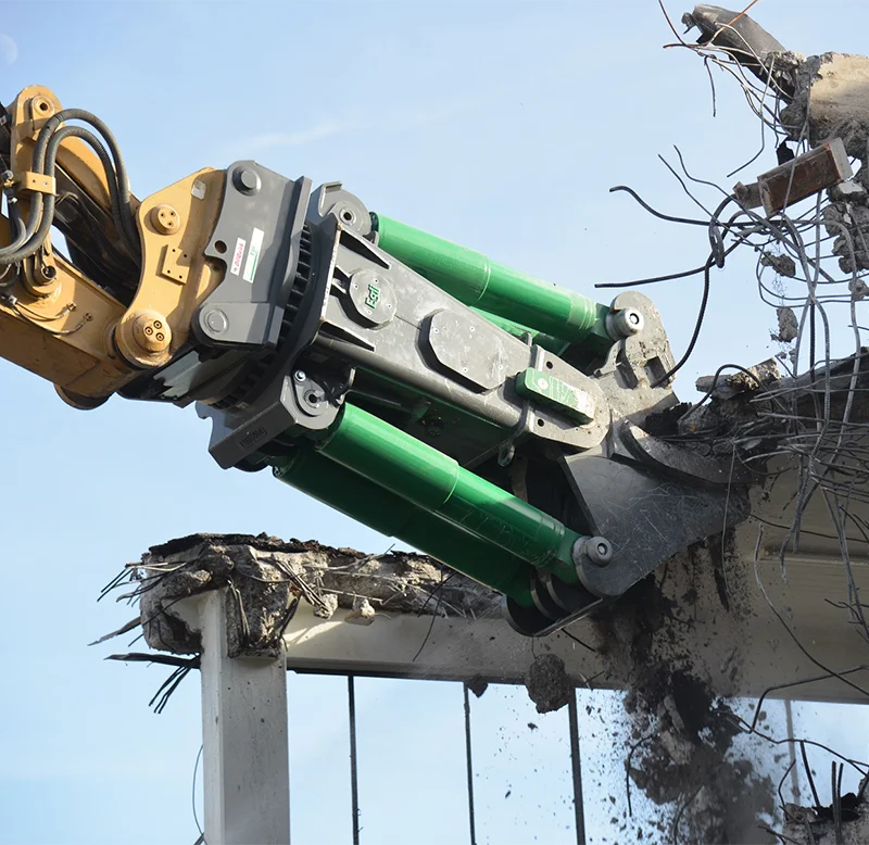 Der Betonbeisser revolutioniert das bisherige Abbruch Konzept im Primär-Abbruch von armiertem Beton und ermöglicht einen brechergerechten Rückbau von Bauwerken. Der Egli-Betonbeisser besteht aus einem Scheren-Grundbody und mehreren Gebissen für die verschiedenen Rückbauaufgaben.
