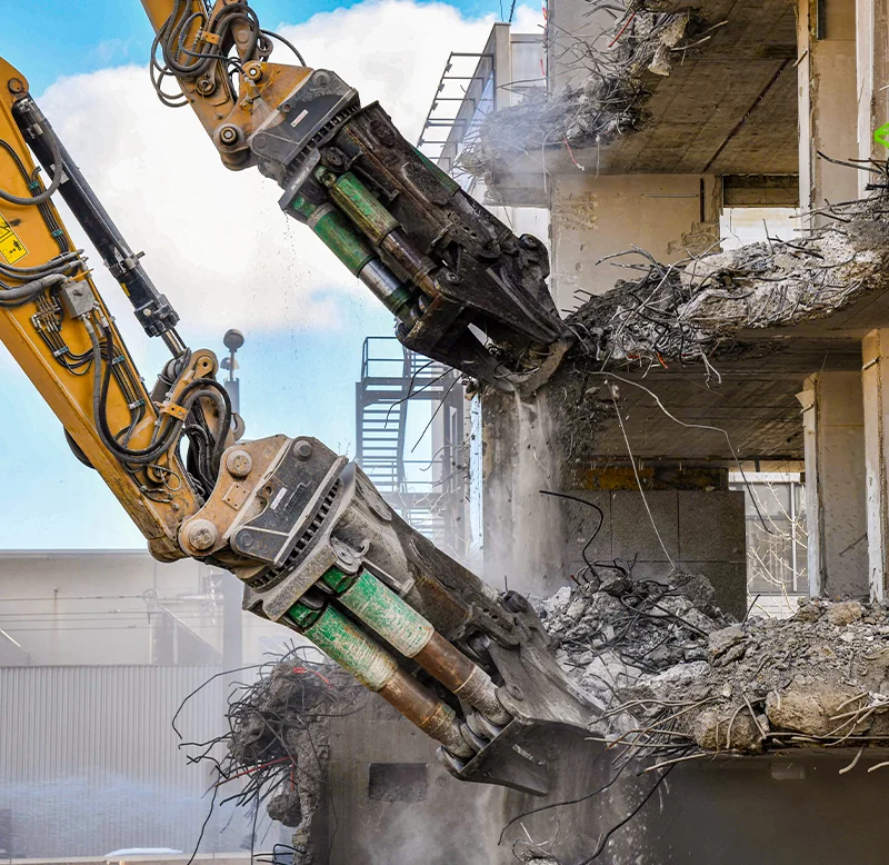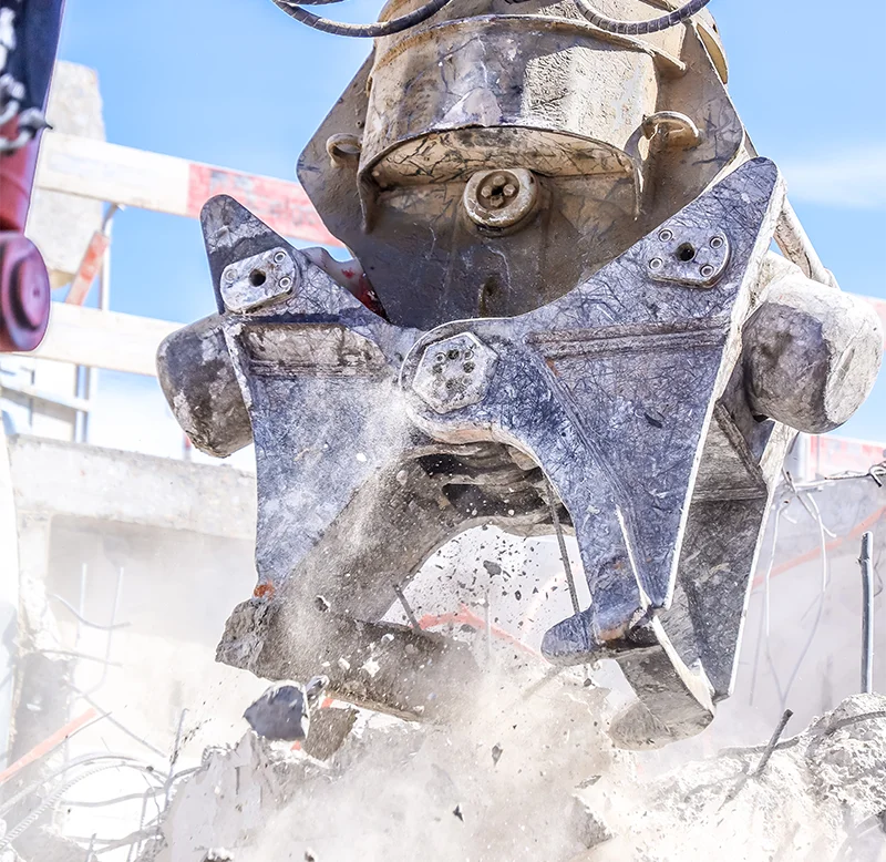Der Betonbeisser revolutioniert das bisherige Rückbau-Konzept: Durch das gleichzeitige Brechen und Schneiden kann ein Arbeitsschritt eingespart werden!